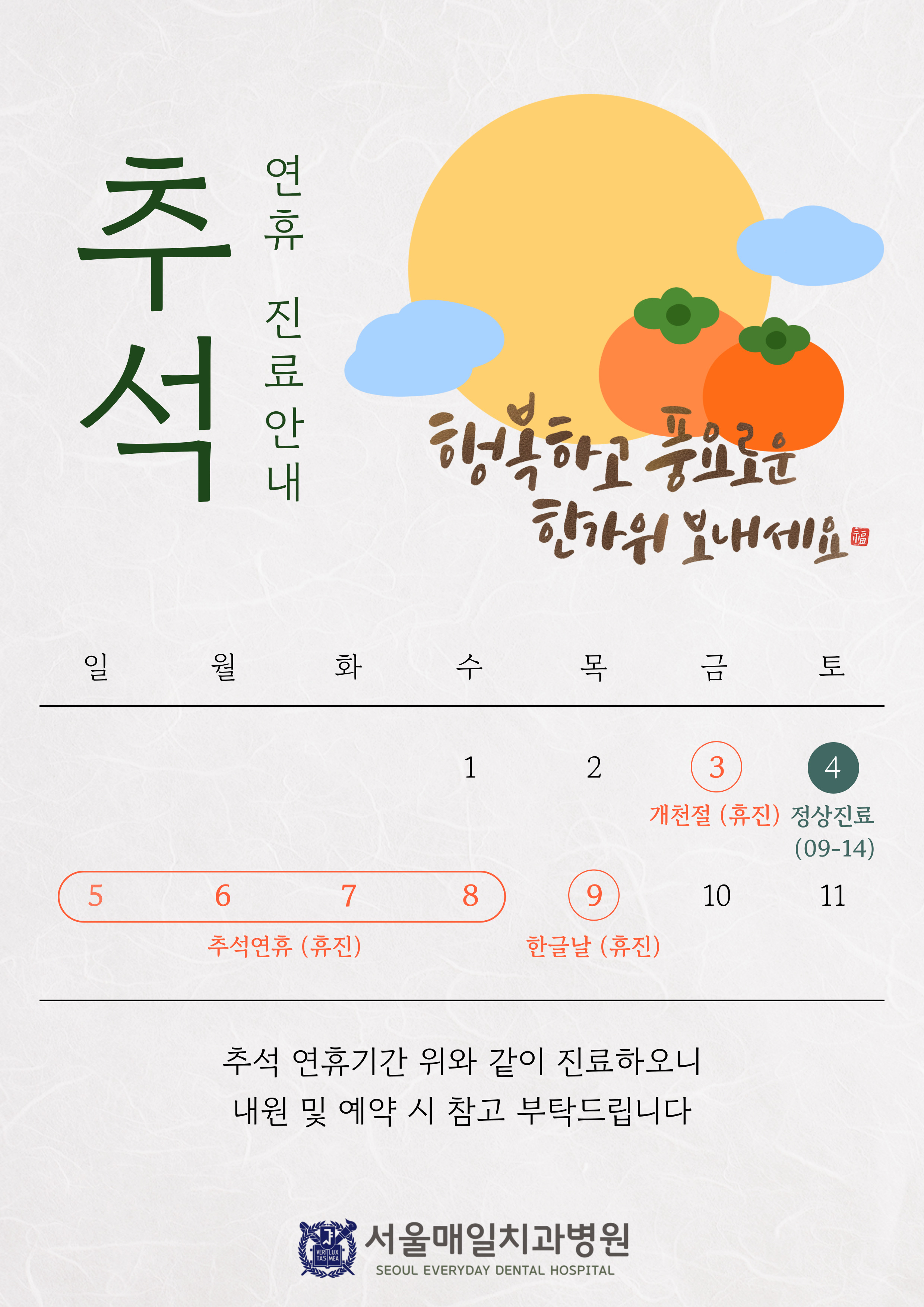 추석 연휴 기간 아래와 같이 진료하오니 내원 및 예약 시 참고 부탁드립니다.