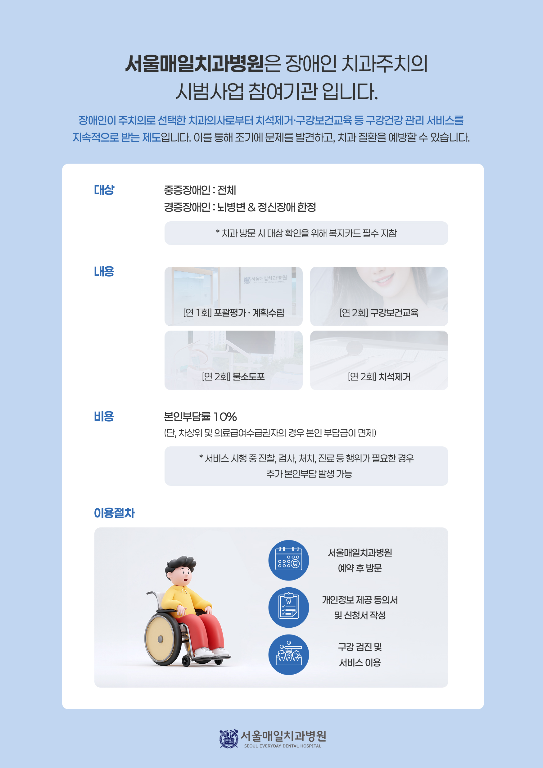 저희 서울매일치과병원이 장애인치과주치의 시범사업에 참여하게 되었습니다.