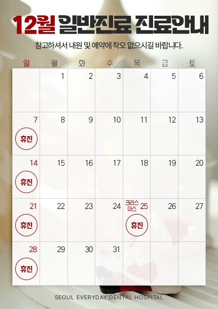 안녕하세요, 12월 일반진료 및 임플란트 진료 안내드립니다.