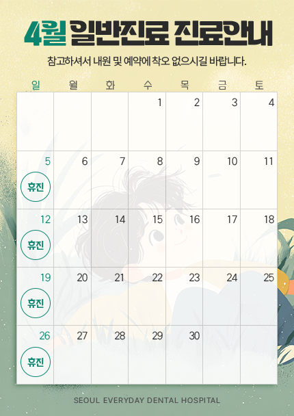 안녕하세요, 4월 일반진료 및 임플란트 진료 안내드립니다.